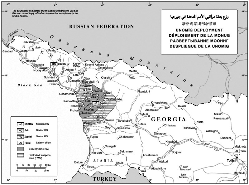 8. Напряженность в грузинско-российских отношениях продолжала сказываться на общей обстановке в регионе. Грузинская сторона продолжала протестовать против планов Российской Федерации по созданию военных баз в Абхазии и Южной Осетии. Она призывала международное сообщество остановить наращивание российских военных сил и добиться того, чтобы российская сторона вывела свои войска с грузинской территории в соответствии с соглашением от 12 августа 2008 года (см. S/2008/631, пункт 11) и отменила свое решение о признании Абхазии и Южной Осетии. Российские должностные лица неоднократно повторяли, что военные базы были созданы на основе соглашений с руководством Абхазии и Южной Осетии. Они также утверждали, что грузинская сторона расширила свое военное присутствие и активизировала свою военную деятельность. Утверждалось, что это выражается, в частности, в присутствии примерно 2000 военнослужащих спецподразделений и войск Министерства внутренних дел вблизи линии прекращения огня, а также примерно 300 военнослужащих около Кодорского ущелья с той стороны, которая находится под контролем Грузии. Миссия не подтвердила сообщения о таком присутствии в ее зоне ответственности в Зугдидском секторе.