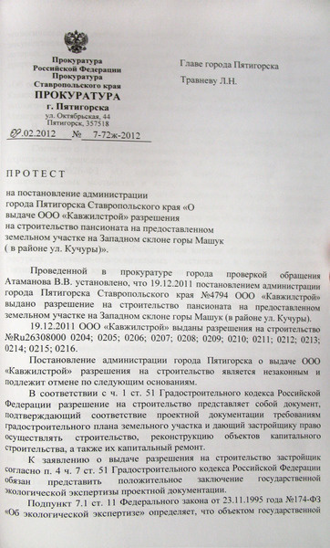Протест прокуратуры на постановление администрации города Пятигорска «О выдаче ООО «Кавжилстрой» разрешения на строительство пансионата на западном склоне горы Машук