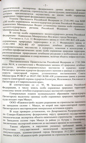 Проведенной в прокуратуре города проверкой обращения Атаманова В.В. установлено, что 19.12.2011 постановлением администрации города Пятигорска Ставропольского края №4794 ООО «Кавжилстрой» выдано разрешение на строительство пансионата на предоставленном земельном участке на Западном склоне горы Машук (в районе ул. Кучуры).