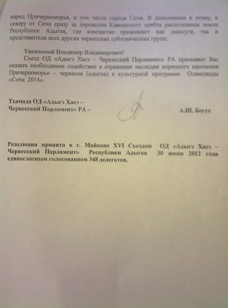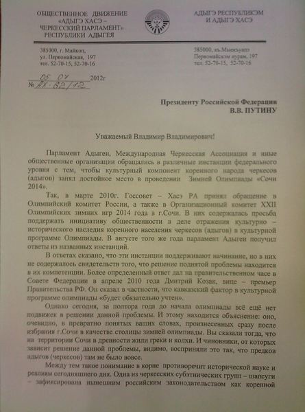 Только Вы в силах изменить ситуацию в пользу решения поднятой нами проблемы. Съезд "Адыгэ Хасэ – Черкесского парламента" призывает Вас оказать необходимое содействие в отражении наследия коренного населения Причерноморья – черкесов (адыгов) в культурной программе Зимней Олимпиады Сочи-2014.