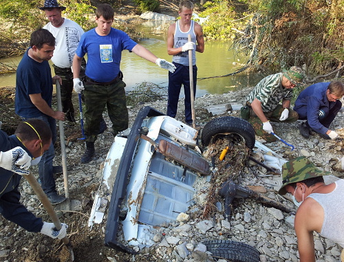 По данным МЧС, в Крымске сейчас работают около 2,5 тысяч волонтеров из разных областей страны. Они разделены на несколько лагерей, ребята помогают развозить гуманитарную помощь, разбирать завалы, обмывать и сушить дома, сообщает РИА «Новости».