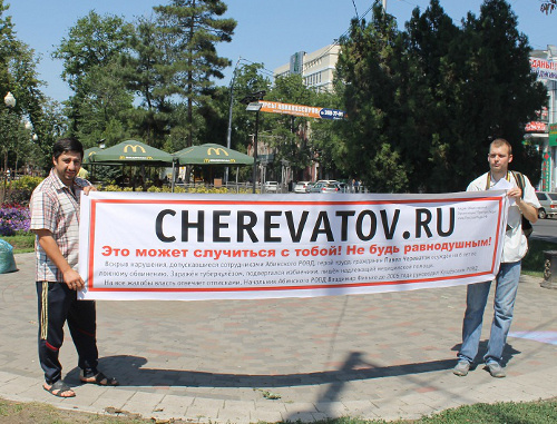Члены общественной организации "Простые люди" Юрий Власов (заявитель публичного мероприятия) и Степан Мулкиджан в 15.00 развернули плакат с адресом сайта в поддержку Череватова cherevatov.ru. Тут же подошел снять их на видеокамеру заведующий сектором общественно-политического мониторинга управления по связям с общественностью городской администрации Ростислав Карамышев. Затем чиновник ушел под навес расположенного напротив кафе "Макдональдс".