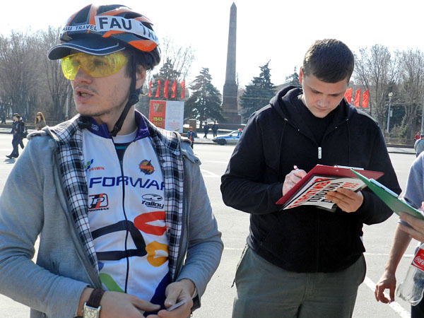 Все желающие могли получить на митинге наклейки "Я за хорошие дороги" и "Я против плохих дорог". Для этого нужно было зарегистрироваться у организаторов. К концу митинга в списках зарегистрированных было более 200 человек.