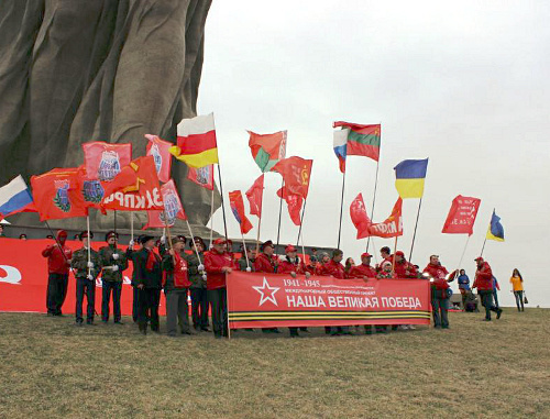 В Волгограде 10 апреля проходил международный автопробег "Наша Великая Победа". Его участники на Мамаевом кургане и у Дома Павлова развернули масштабную копию Знамени Победы.