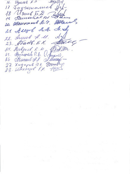 Раджабов Р.Г., Канберов М.Г., Гаджиев М.Г., Муртузалиев М.М., Шанавазов Н.М, Пайзулаев М.М., Казибеков И.Г., Магомедов М.Г., Арацилов М.С., Абдуллаев Г.Б., Газиев Г.М., Магомедов М.К., Омаров М.М., Гусейханов И.Г., Ахмедов Э.И., Изилов А.Р., Гаджиалиев М.М., Изиев Б.Д., Пашабеков Х.Э., Шамхалов Д.Ч., Авезов М.А., Алиев А.М., Абасов Б.Х., Давдиев К.М., Акулиничев С.В., Мачаев А.А., Хидиров Э.Я., Шахпазов Р.Н.