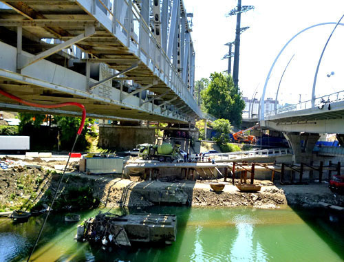 На левом и правом берегу реки Сочи очень много рабочих, около ста человек. Так же много рабочих на самом мосту.