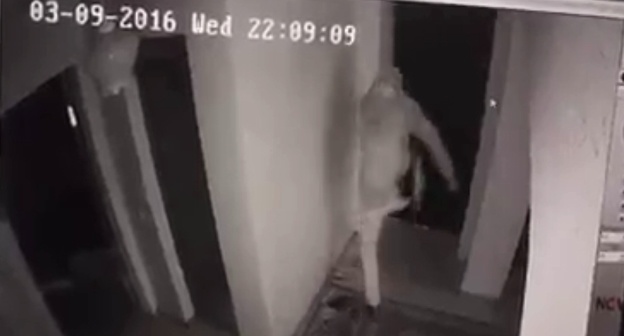 Юрист Комитета по предотвращению пыток Дмитрий Утукин в Twitter распространил запись с камеры наблюдения, на которой видно, как человек в маске пытается выломать дверь. На поясе у него предмет, напоминающий пистолет. "Вооруженный человек пытается выбить дверь изнутри нашей квартиры в Яндаре", - написал Утукин.