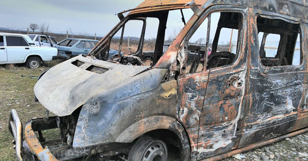 телеканал ("Кавказский узел" может сообщить название организации по запросу) опубликовал сегодня видеозапись ночного осмотра машины правозащитников, который провели ингушские силовики. Оператор видео стоял рядом с поврежденной машиной. На записи видно, что кузов и салон микроавтобуса выгорели полностью. Длительность видео составляет 38 секунд.