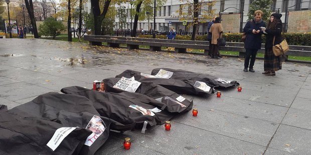 Разложенные "трупы" должны были шокировать проходящих граждан, продолжил Кондратенко. "Конечно, человек обращает внимание на лежащие на тротуаре тела. К сожалению, Лермонтовская площадь имеет слабую пропускную способность, но выдать другую власти нам отказались — не удалось согласовать. В лучшем случае предлагали гайд-парк Сокольников на опушке леса", - отметил Кондратенко.