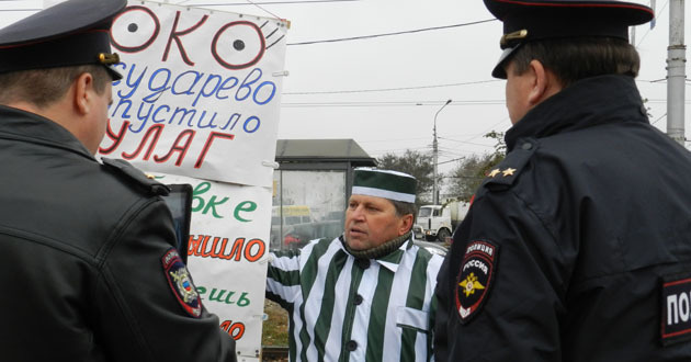 Дегтярев сегодня провел пикет напротив прокуратуры в Дзержинском районе Волгограда в полосатом костюме, имитирующем робу заключенного, с плакатом "Око государево пропустило ГУЛАГ. В Дубовке закон что дышло - куда провернешь, туда и вышло. По Дубовке бродит вор. Отписки пишет прокурор".