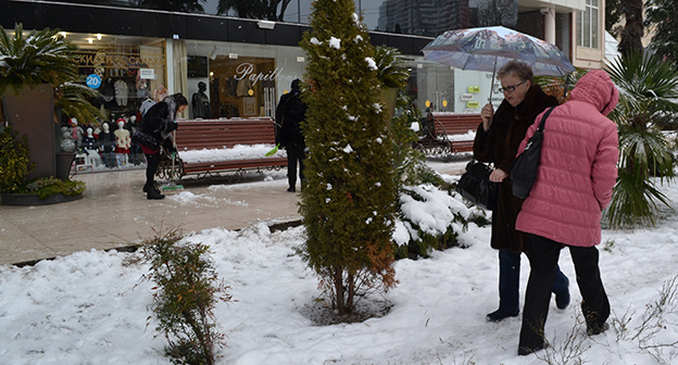 "В холодное время не сбивают снег с веток, не укрывают пластиком пальмы и цитрусовые, чтобы они не мерзли. Город просто оскудел, лишился растительности, перестал быть зеленым. А этот снег унесет жизни еще многих деревьев", – сказала корреспонденту "Кавказского узла" местная жительница Вера Зельдина, которая во время снегопада выходит с палкой, чтобы сбить снег с веток деревьев.
