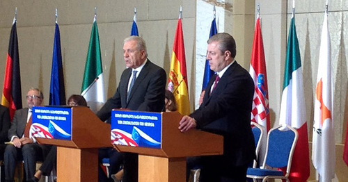 Сегодня представительство Евросоюза в Грузии провело в отеле "Билтмор" в Тбилиси пресс-конференцию, на которой к гражданам Грузии обратились еврокомиссар по вопросам миграции, внутренних дел и гражданства Димитрис Аврамопулос и премьер-министр Грузии Георгий Квирикашвили, передает корреспондент "Кавказского узла".