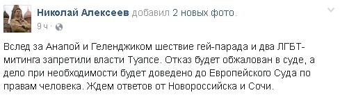 Основатель московского гей-прайда Николай Алексеев подал заявки на проведение митингов и шествий в поддержку ЛГБТ в пяти городах Кубани. Власти Геленджика, Анапы и Туапсе отказались согласовать акции. Реакции на заявку властей Новороссийска и Сочи пока не поступало.