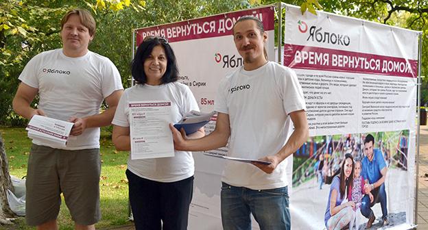 30 августа три члена партии "Яблоко" Ирэн Ильенкова, Алексей Челмакин и Павел Лисичкин на Курортном проспекте с 16.00 до 19.00 между рестораном "Каскад" и бывшим кинотеатром "Стерео" провели пикет против участия России в военных действиях в Сирии, передает корреспондент "Кавказского узла".