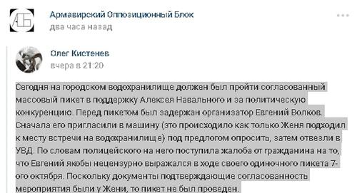 Сотрудники полиции задержали его непосредственно на месте акции незадолго до ее начала, сообщается на странице "Армавирского оппозиционного блока" в социальной сети "Вконтакте".