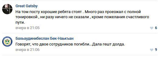 "На том посту хорошие ребята стоят . Много раз проезжал с полной тонировкой, ни разу ничего не сказали , кроме пожелания счастливого пути", - прокомментировал 5 ноября известие о нападении на пост пользователь сообщества The Magas times под ником Great Gatsby.