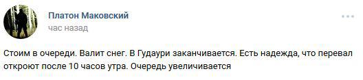 "Сейчас закрыто только в сторону границы от Гудаури, или в обе? Огромная просьба, пишите, если будет движение в сторону границы!" – написал сегодня пользователь под ником Kristina Vilain.
