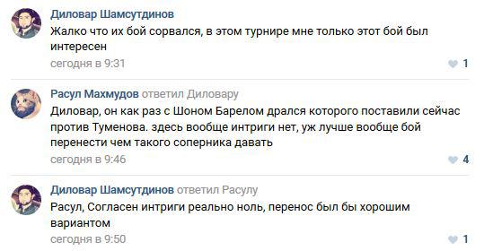 "Диловар, он как раз с Шоном Барелом дрался которого поставили сейчас против Туменова. здесь вообще интриги нет, уж лучше вообще бой перенести чем такого соперника давать", - ответил ему пользователь Расул Махмудов.