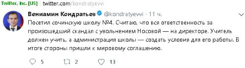 "Посетил сочинскую школу №4. Считаю, что вся ответственность за произошедший скандал с увольнением Носовой — на директоре. Учитель должен учить, а администрация школы — создать условия для его работы. В итоге стороны пришли к мировому соглашению", - написал губернатор Краснодарского края Вениамин Кондратьев на своей странице в Twitter.