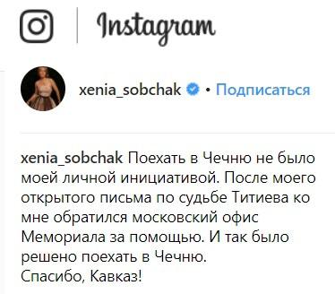 Сама Ксения Собчак заявила, что поездку в Чечню она совершила "не по личной инициативе". "После моего открытого письма по судьбе Титиева ко мне обратился московский офис "Мемориала" за помощью. И так было решено поехать в Чечню", - написала сегодня Собчак на своей странице в Instagram. (Дополнение "Кавказского узла" от 14.38 мск 31.01.2018: позже Собчак внесла исправление в свою запись, заменив фразу "ко мне обратился московский офис "Мемориала" на слова "мы стали сотрудничать с московским офисом Мемориала по дальнейшей медийной помощи. Мы консультировались с ними").