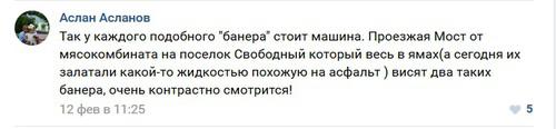 "Так у каждого подобного баннера стоит машина. Проезжая мост от мясокомбината на поселок Свободный, который весь в ямах (а сегодня их залатали какой-то жидкостью, похожей на асфальт), висят два таких баннера, очень контрастно смотрится", - заявил 12 февраля в комментариях еще один участник группы Аслан Асланов.