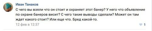 "С чего вы взяли что он стоит и охраняет этот баннер? У него что объявление по охране баннеров висит? С чего такие выводы сделали? Может он там ждет какого стоит? Или еще что. Бред какой-то", - в свою очередь отметил пользователь Иван Танаков.