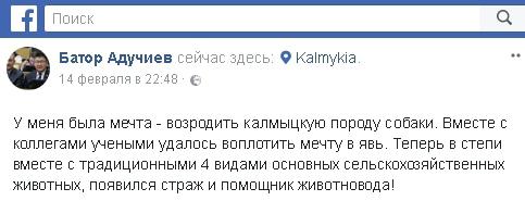 "У меня была мечта – возродить калмыцкую породу собаки. Вместе с коллегами-учеными удалось превратить мечту в явь. Теперь в степи вместе с четырьмя традиционными видами основных сельскохозяйственных животных (верблюд, овца, корова, лошадь, – прим. редакции) появился страж и помощник животновода", – написал Адучиев на своей странице в Facebook.