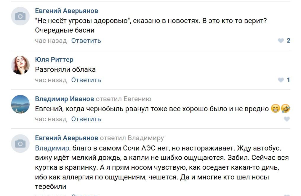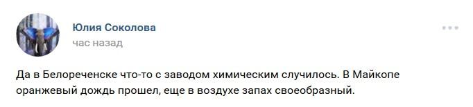 "Да в Белореченске что-то с заводом химическим случилось. В Майкопе оранжевый дождь прошел, еще в воздухе запах своеобразный", - написала пользователь соцсети "ВКонтакте" Юлия Соколова.