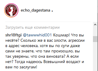 "Сколько же в вас злости, агрессии в адрес человека, хотя вы по сути даже сами не знаете, что там произошло, вы так уверены, что она виновата? А если нет? Тогда надеюсь Всевышний воздаст и вам по заслугам!.. Толком ещё не ясно, что произошло, а праведники уже вовсю распустили языки, вынесли приговоры, про парня-убийцу уже почти забыли, на первый план вышла девушка, видимо её персона показалась интересней для обсуждения.. набрали в общем себе грехов", – написал пользователь под ником shr18ftgi.