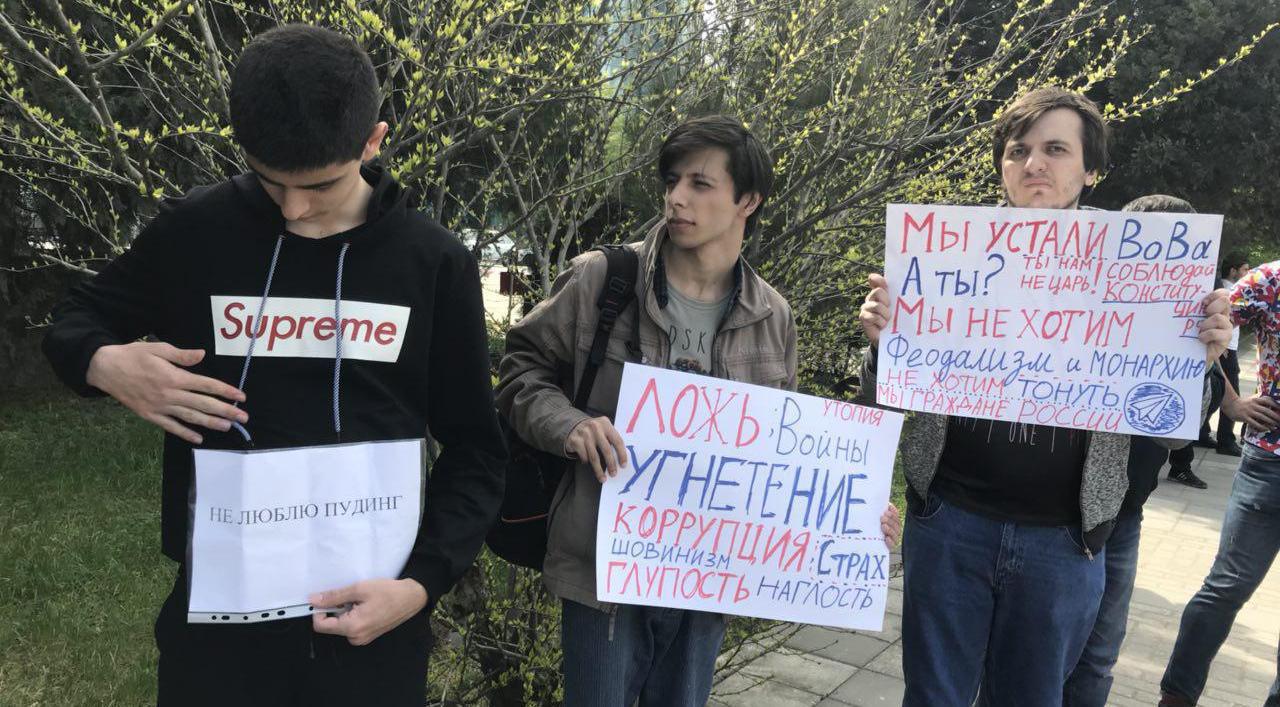 Протестующие пришли с плакатами "Я не люблю пудинг", "Мы устали, Вова! А ты?". Они требуют отставки Владимира Путина и российского правительства. Блокировка мессенджера Telegram и другие ограничения в интернете, по их мнению, нарушают свободу слова и тайну переписки, сообщает корреспондент "Кавказского узла".