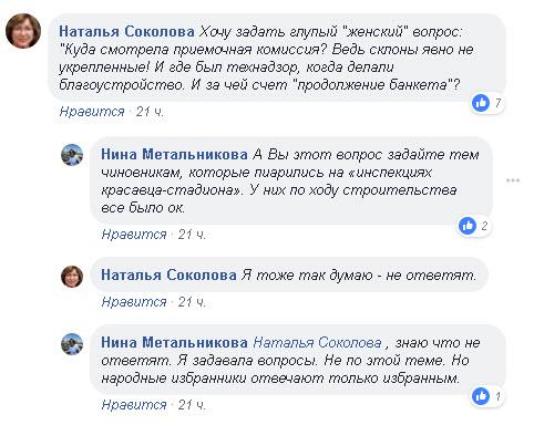 "Куда смотрела приемочная комиссия? Ведь склоны явно не укрепленные! И где был технадзор, когда делали благоустройство. И за чей счет "продолжение банкета"?" - написала Наталья Соколова.