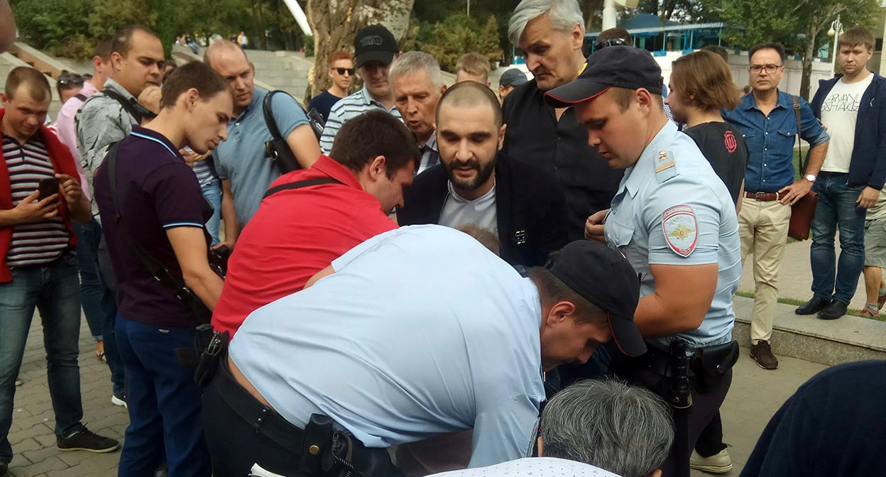 Власти Ростова-на-Дону не согласовали сторонникам Навального сегодняшнюю акцию протеста, но противники пенсионной реформы пришли сегодня на Фонтанную площадь. Полицейские задержали координатора местного штаба Навального Сергея Гривко, сообщил корреспондент "Кавказского узла".
