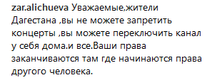 "Уважаемые жители Дагестана, вы не можете запретить концерты, вы можете переключить канал у себя дома, и все. Ваши права заканчиваются там, где начинаются права другого человека", - сообщил участникам дискуссии пользователь zar.alichueva.