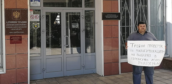 Алексей Ульянов, баллотировавшийся в гордуму Волгограда, провел сегодня три одиночных пикета, потребовав от облизбиркома и прокуратуры заняться проверкой данных о фальсификации выборов.