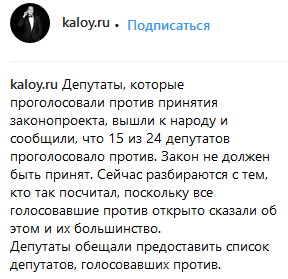 "Депутаты, которые проголосовали против принятия законопроекта, вышли к народу и сообщили, что 15 из 24 депутатов проголосовало против. Закон не должен быть принят. Сейчас разбираются с тем, кто так посчитал, поскольку все голосовавшие против открыто сказали об этом и их большинство", - написал в своем посте Калой Ахильгов.
