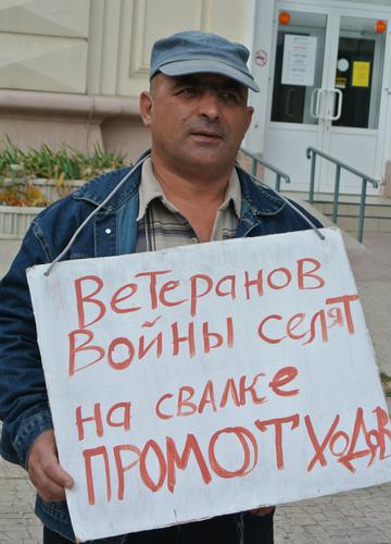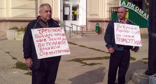 Четверо пикетчиков, сменяя друг друга, сегодня с 10:00 до 12:30 мск провели акцию протеста у знака "Нулевой километр" в центре Астрахани. В руках участники пикета держали плакаты: "Требуем! Выделить пригодные земли для ветеранов Великой Отечественной войны", "Ветеранов войны селят на свалке промотходов". Сотрудники полиции, зная о том, что пикетирование согласовано в администрации города, не мешали проведению акции, сообщил корреспонденту "Кавказского узла" организатор пикета Сергей Родионов.