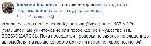 "Уголовное дело в отношении Кузнецова (Хаски) по ст. 167 УК РФ "Умышленные уничтожение или повреждение имущества" не возбуждалось. Пока проводится проверка по заявлению владелицы автомобиля, на крыше которого артист и исполнил свою песню", - написал сегодня адвокат Алексей Аванесян на своей странице в Facebook.