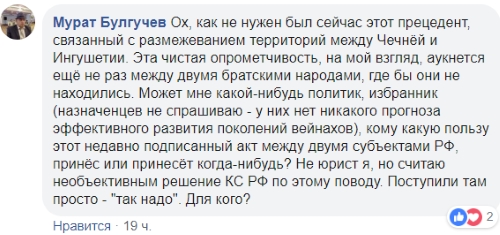 "Ох как не нужен был сейчас этот прецедент, связанный с размежеванием территорий между Чечнёй и Ингушетией. Эта чистая опрометчивость, на мой взгляд, аукнется ещё не раз между двумя братскими народами, где бы они ни находились. Может мне какой-нибудь политик, избранник (назначенцев не спрашиваю - у них нет никакого прогноза эффективного развития поколений вейнахов), кому какую пользу этот недавно подписанный акт между двумя субъектами РФ принёс или принесёт когда-нибудь? Не юрист я, но считаю необъективным решение КС РФ по этому поводу. Поступили там просто - "так надо". Для кого?" - задал вопрос Мурат Булгучев.