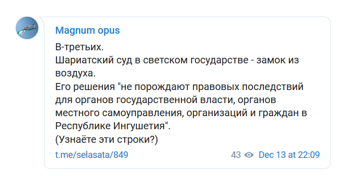"Шариатский суд в светском государстве - замок из воздуха. Его решения "не порождают правовых последствий для органов государственной власти, органов местного самоуправления, организаций и граждан в Республике Ингушетия"", - написал, процитировав постановление КС Ингушетии по вопросу соглашения о границе, автор Telegram-канала Magnum opus.