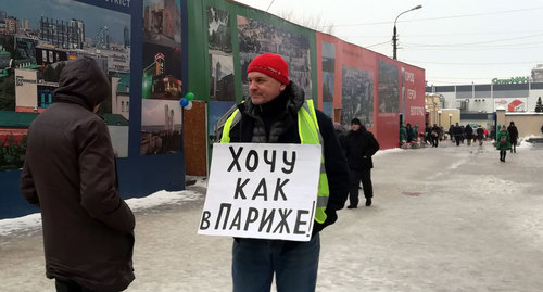 Владимир Тельпук, стоявший с плакатом "Хочу как в Париже", заявил корреспонденту "Кавказского узла", что его плакат "ни к чему не призывает, но показывает, что рабочие Франции с помощью митингов добились, чтобы президент перед ними извинился, были отменены налоги, которые протестующие считали завышенными". "То есть рабочие Франции добились своих законных требований путем митингов и забастовок, – сказал Тельпук. – В нашей стране, к сожалению, так не получается. Мы стоим, чтобы показать людям, что в нашей стране есть люди, которые не согласны с действующей властью".