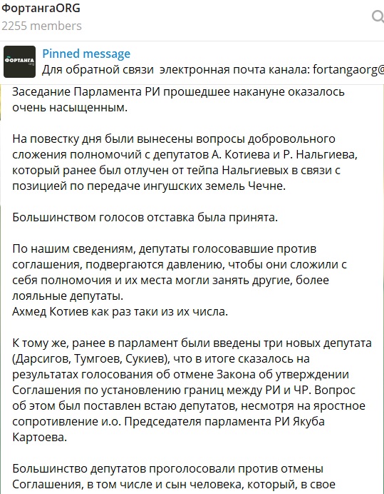 "На повестку дня были вынесены вопросы добровольного сложения полномочий с депутатов А.Котиева и Р.Нальгиева, который ранее был отлучен от тейпа Нальгиевых в связи с позицией по передаче ингушских земель Чечне. Большинством голосов отставка была принята. По нашим сведениям, депутаты голосовавшие против соглашения, подвергаются давлению, чтобы они сложили с себя полномочия и их места могли занять другие, более лояльные депутаты. Ахмед Котиев как раз таки из их числа", - подчеркивается в сообщении.