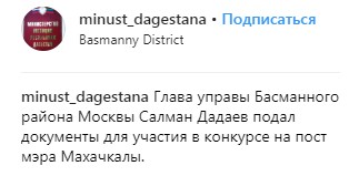 «Глава управы Басманного района Москвы Салман Дадаев подал документы для участия в конкурсе на пост мэра Махачкалы», - говорится в сообщении на странице министерства в соцсети Instagram.