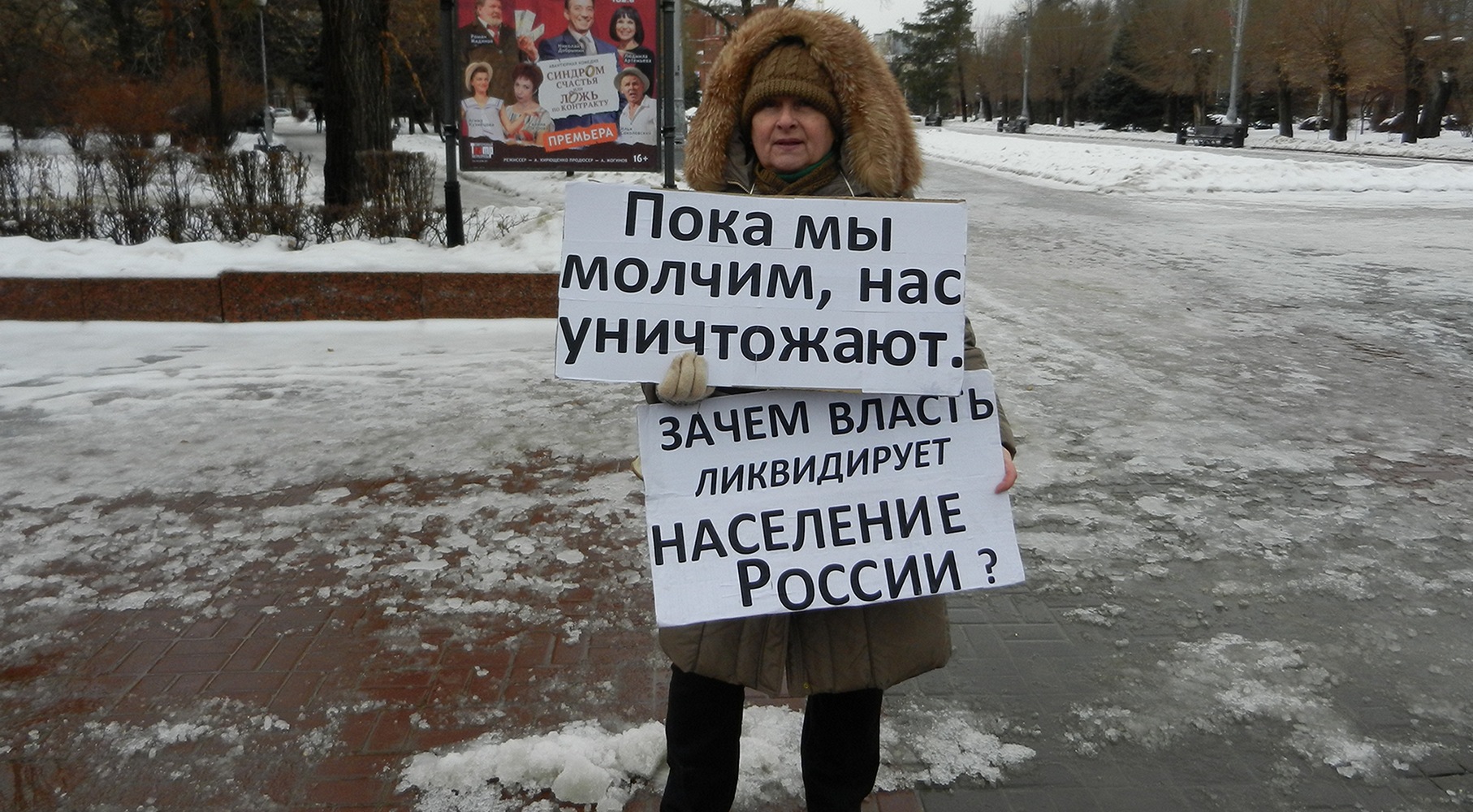Активистка провела пикет на аллее Героев в Волгограде с 13.30 до 15.30 по местному времени (с 12.30 до 14.30 мск). У нее были плакаты "Волгоград попал в пятерку аутсайдеров в рейтинге самых неэффективно управляемых городов России", "Пока мы молчим, нас уничтожают" и "Зачем власть ликвидирует население России?"