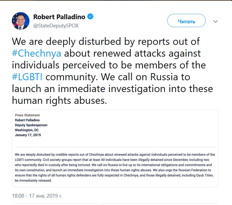 "Мы глубоко обеспокоены заслуживающими доверия сообщениями из Чечни о возобновлении нападений на лиц, считающихся членами ЛГБТ-сообщества. Мы призываем Россию выполнить свои международные обязательства и обязательства своей Конституции и немедленно начать расследование этих нарушений прав человека", - говорится в опубликованном 17 января заявлении в аккаунте заместителя представителя Госдепартамента Роберта Палладино соцсети Twitter.