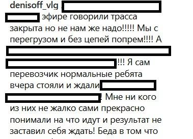 "В эфире говорили - трасса закрыта, но нет, нам же надо.. с перегрузом и без цепей попрем! Я сам перевозчик. Нормальные ребята вчера стояли и ждали. Сами прекрасно понимали, на что идут. Беда в том что за рулём большегрузов появилось много молодняка", - написал сегодня в комментарии к записи пользователь с ником denisoff_vlg.