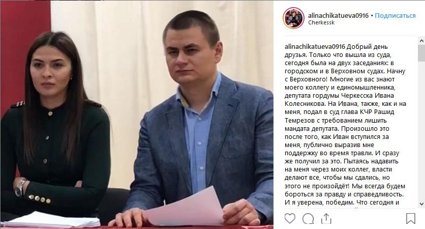 Процесс по иску главы республики Рашида Темрезова о лишении полномочий депутата городской думы Черкесска Алины Чикатуевой привлек внимание к персоне молодого парламентария, которая прежде не проявляла большой активности на политической арене и запомнилась своими миловидными селфи в Instagram. Чикатуева не признала обвинения в нарушении антикоррупционного законодательства и опубликовала в соцсети свою декларацию о доходах.