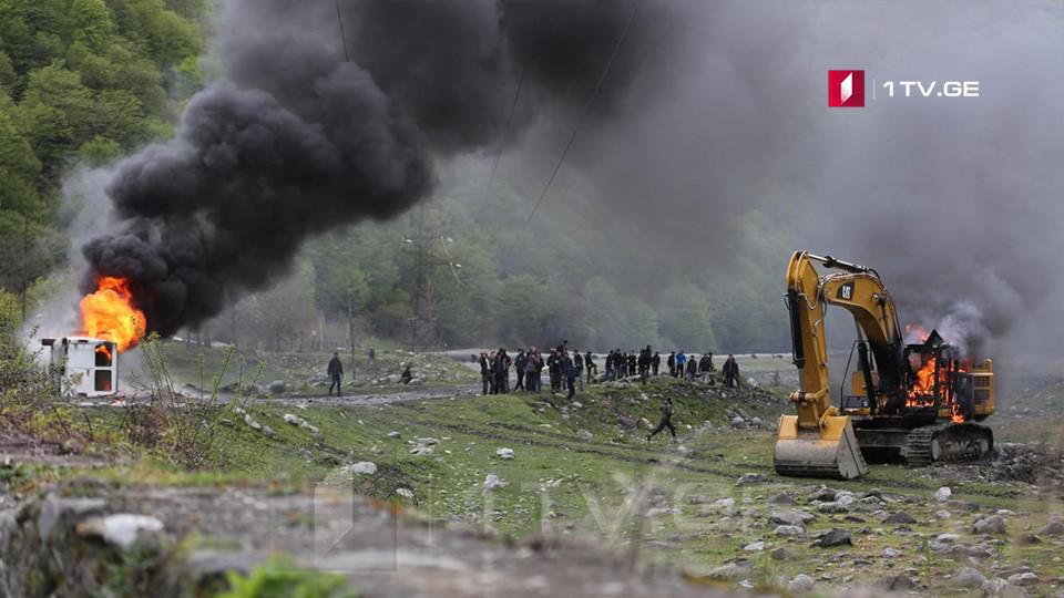 Противники ГЭС в Панкисском ущелье подожгли строительную технику и полицейские машины. 15 силовиков в столкновениях с протестующими получили травмы, сообщили в МВД.