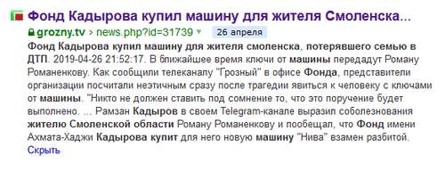 Согласно данным, сохранившимся в кэше поисковой системы "Яндекс", 26 апреля в 21.52 мск ЧГТРК "Грозный" опубликовала на своем сайте новость "Фонд Кадырова купил машину для жителя Смоленска, потерявшего семью в ДТП". "В ближайшее время ключи от машины передадут Роману Романенкову (так указана в публикации фамилия пострадавшего. - Прим. "Кавказского узла"). Как сообщили телеканалу "Грозный" в офисе фонда, представители организации посчитали неэтичным сразу после трагедии явиться к человеку с ключами от машины", - говорилось в публикации, которая позже была удалена с сайта ЧГТРК.