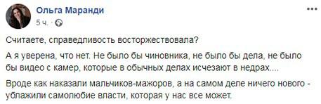 "Считаете, справедливость восторжествовала? А я уверена, что нет. Не было бы чиновника, не было бы дела, не было бы видео с камер, которые в обычных делах исчезают в недрах... Вроде как наказали мальчиков-мажоров, а на самом деле ничего нового - ублажили самолюбие власти, которая у нас все может. Я не оправдываю их, да мажоры, да при бабле, да за рамками понимания. И я тоже выступала за наказание. Но наказание наказанию рознь", - написала на своей странице в Facebook Ольга Маранди.