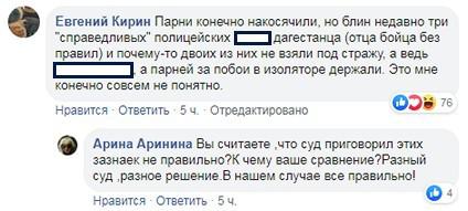 "К вашему сведению всем первоходам (это те, которые совершили проступок впервой) дают условно по таким статьям. Они просто нахлобучили пару чинуш, вот и наказывают их. Хотя у нас все равны перед законом, но кто-то ровнее", - ответил ей Махмудов Джамалутдин.